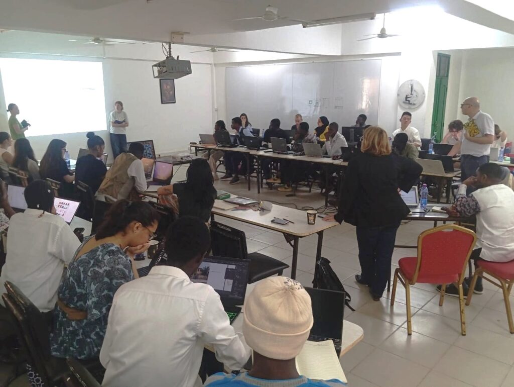 Photo de l’équipe en charge de l’atelier avec la Directeur Général représenté ici par le Directeur des Affaires Académiques et de la Scolarité, Dr. DANVIDE (milieu photo)Séance de travail en salle JSA EAMAU